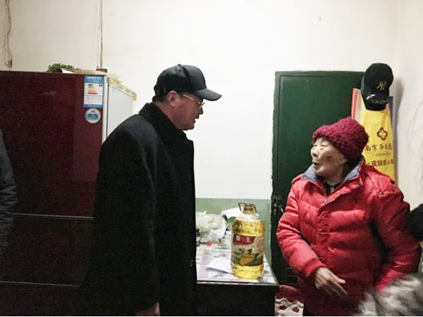 上午9时,金总一行在劝业路社区负责人的引领下,来到王秀英奶奶家进行了走访和慰问,为王奶奶送上大米、食用油、春联等慰问用品,使其感受到了公司干部职工的关爱和社会大家庭的温暖。王奶奶和老伴潘承培都患有癌症,王奶奶更是笑言:“我现在身体里面的器官基本上都换过一遍了。”经过一系列的治疗加上积极向上的心态,二老现在已经基本痊愈,且精神矍铄。金总亲切地与老人交谈,了解老人的身体健康,生活饮食等状况,嘱咐她保重身体,并祝福他们新春快乐,阖家幸福。